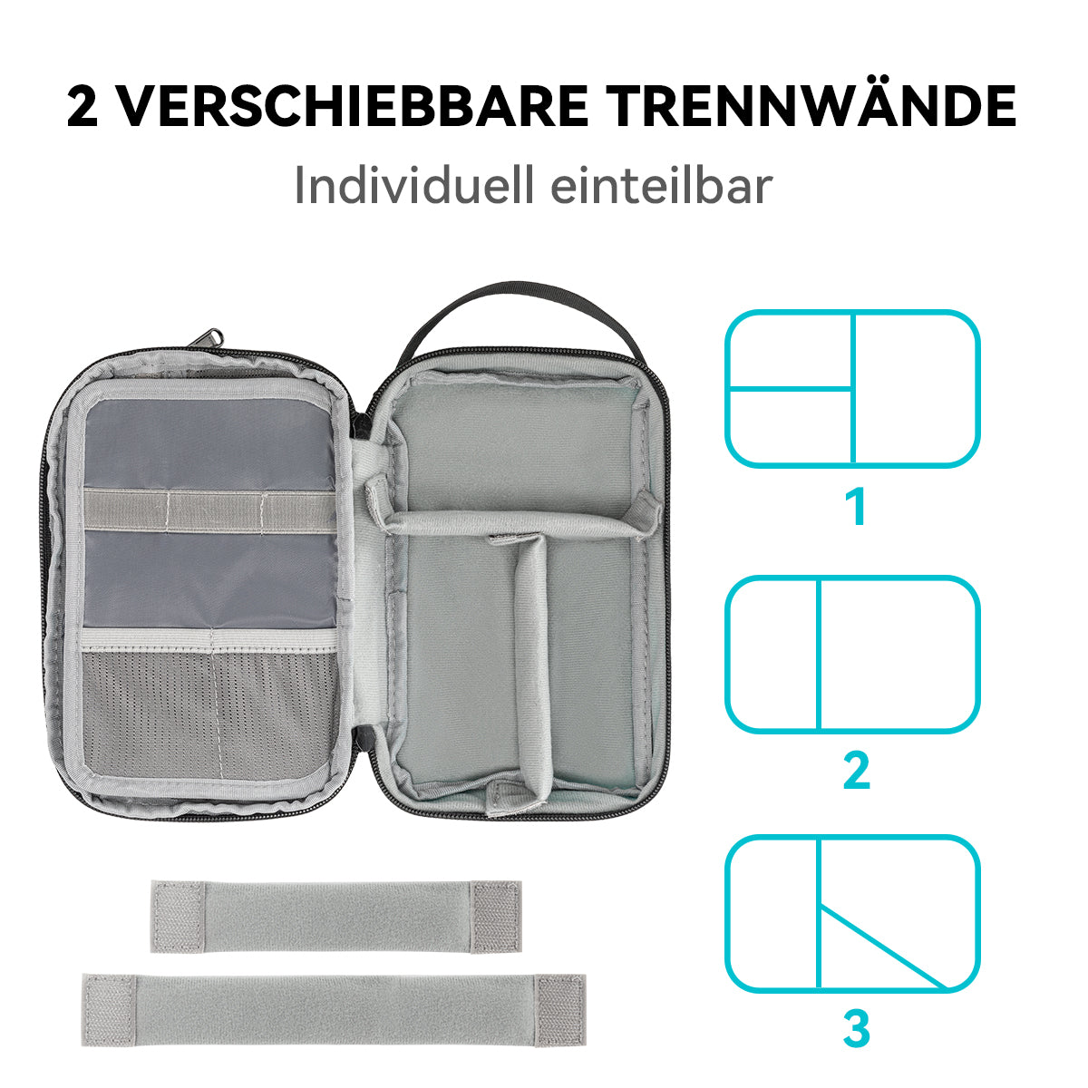 • Vak met verplaatsbare verdelers met klittenband (zelf indelen) voor grotere items zoals een wereldstekker, computermuis, laptop oplader (afhankelijk van grootte), GoPro camera en accessoires, etc.
