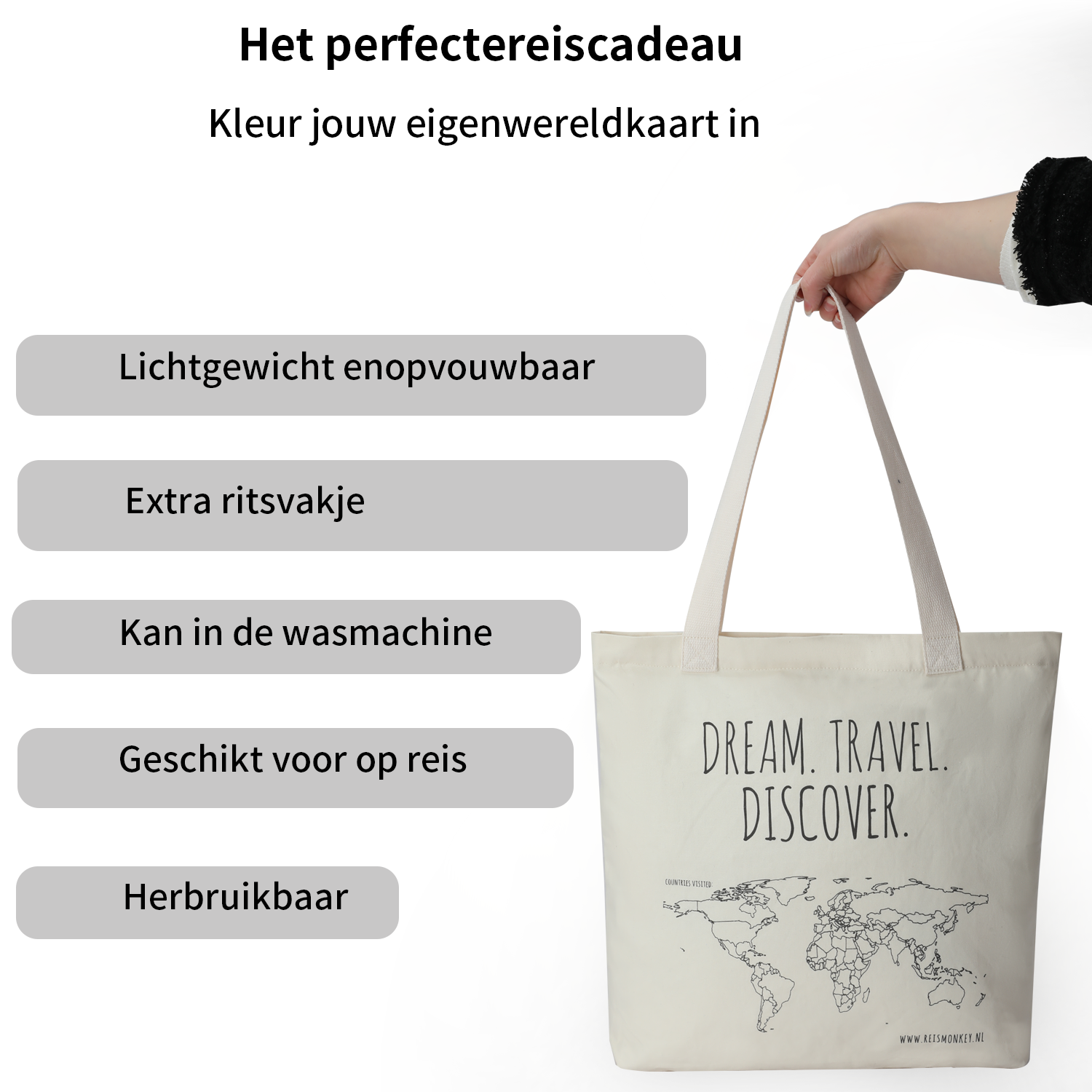 Deze katoenen tas wordt alleen bij Reismonkey aangeboden en is leuk voor een verjaardag of als afscheidscadeau voor een reiziger. De tekst 'Dream, Travel, Discover' is toepasselijk. Het leuke is dat jouw reizende vriend of vriendin met een stift alle landen in kan kleuren die hij of zij bezocht heeft.