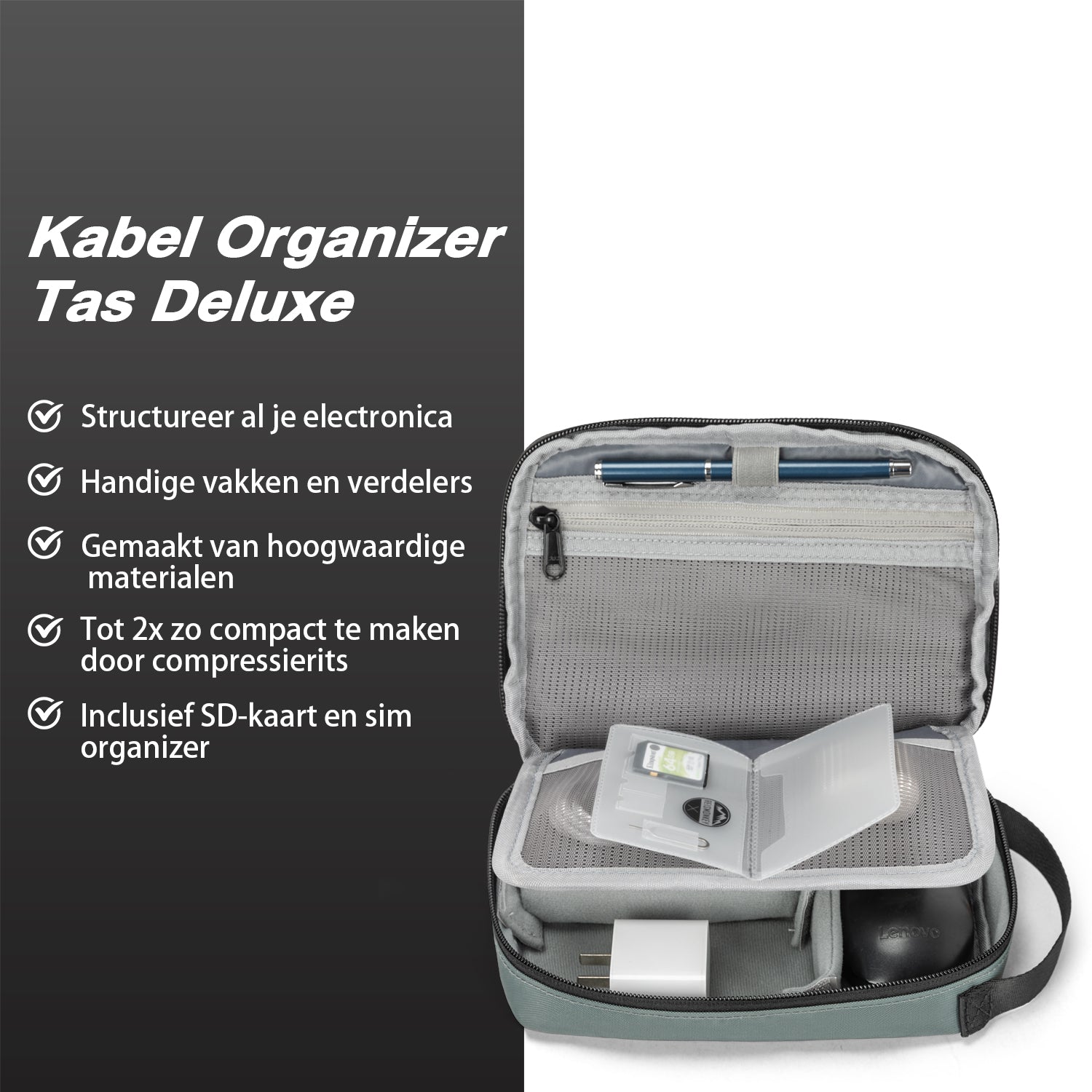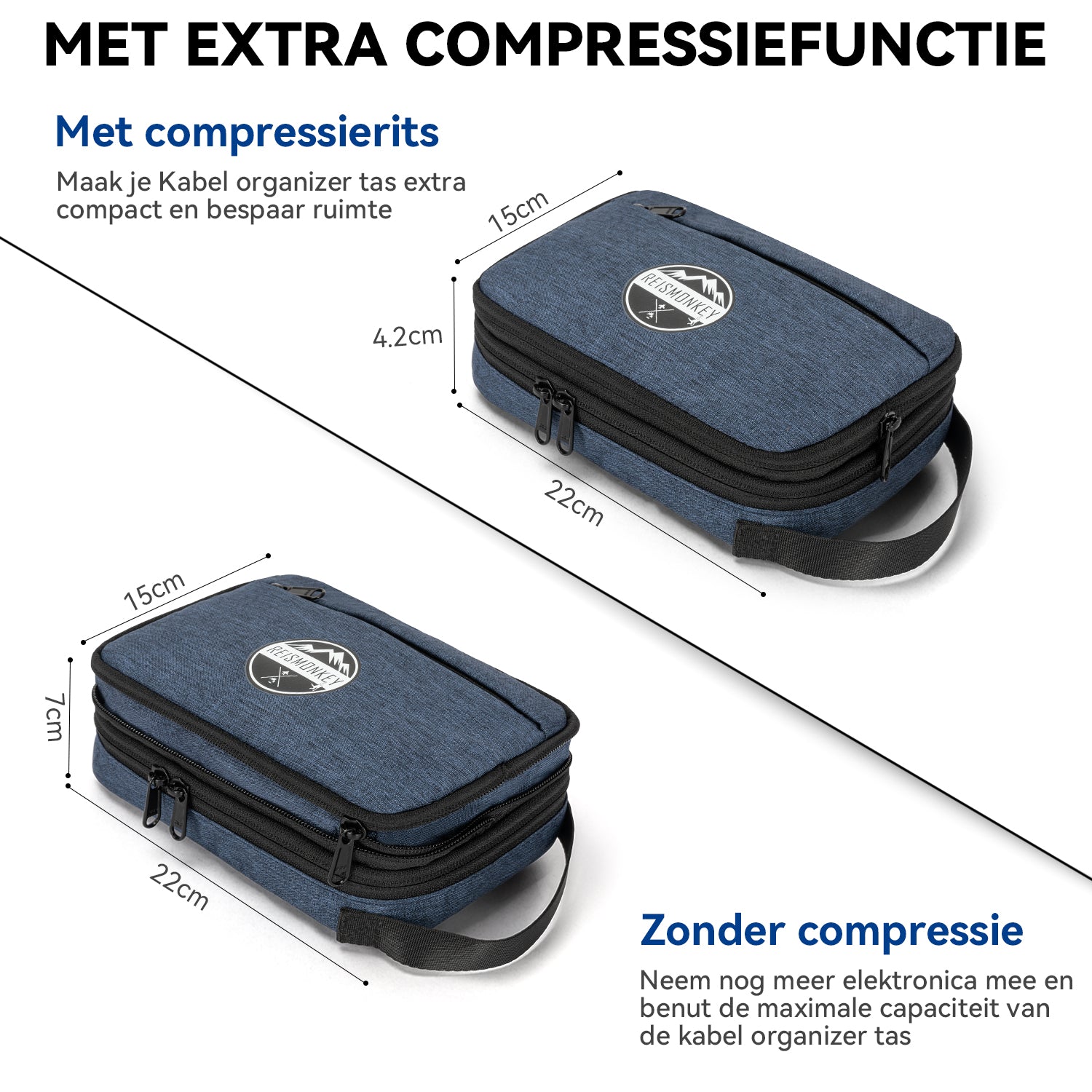 Deze kabeltas is ruimer dan de kleinere variant, het kabel organizer tasje,  maar dit is de extra luxe variant met extra handigheidjes. Door de compressiefunctie past er toch een stuk meer in en scheelt het qua ruimte niet veel.