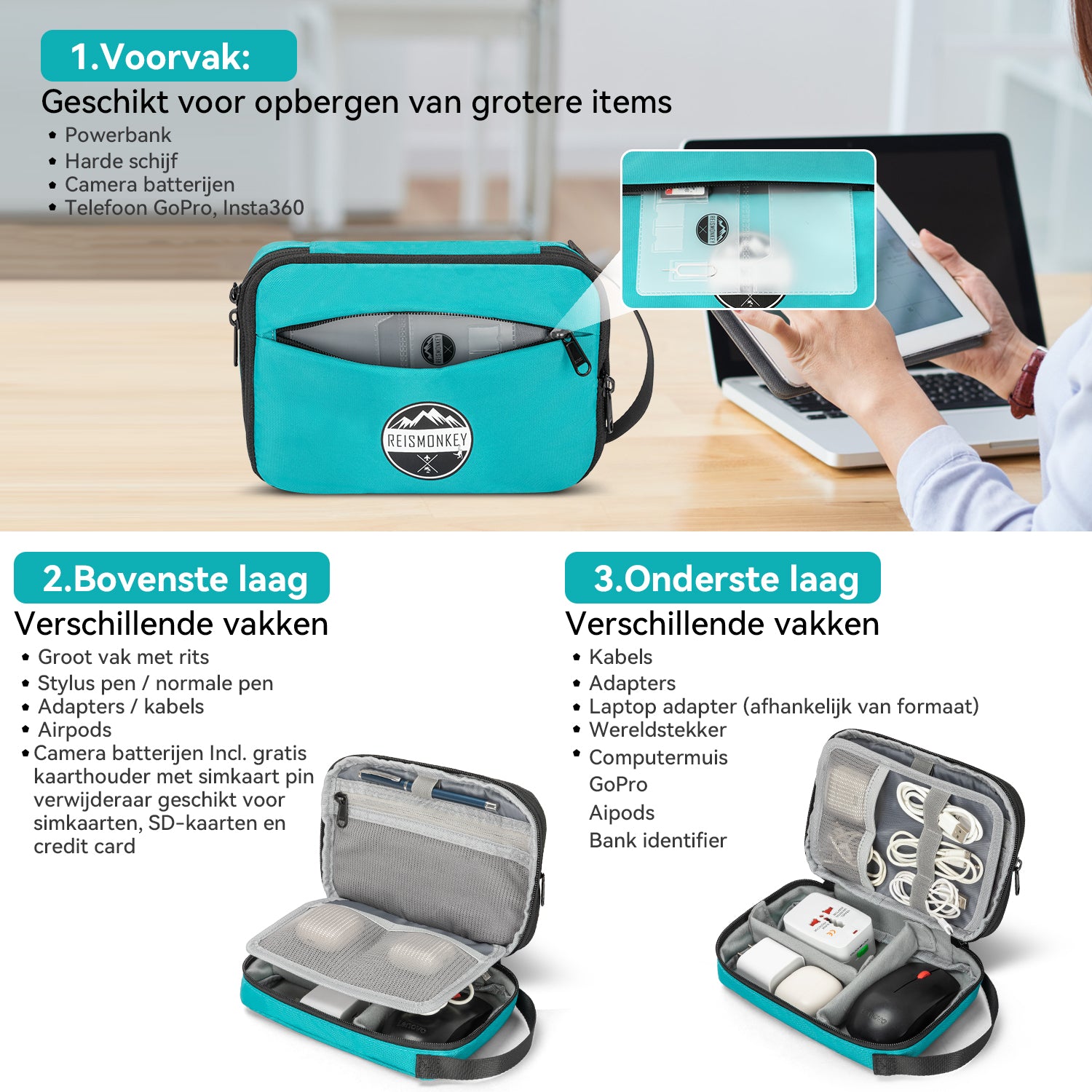 Tijdelijke actie: Shop deze Kabel Organizer tas nu in jouw favoriete kleur en krijg er een GRATIS  Reismonkey Sim- en SD-kaart organizer met sim pin (t.w.v. 4,99) bij. (let op: de voorraad van deze SD-kaart organizers zijn beperkt)
