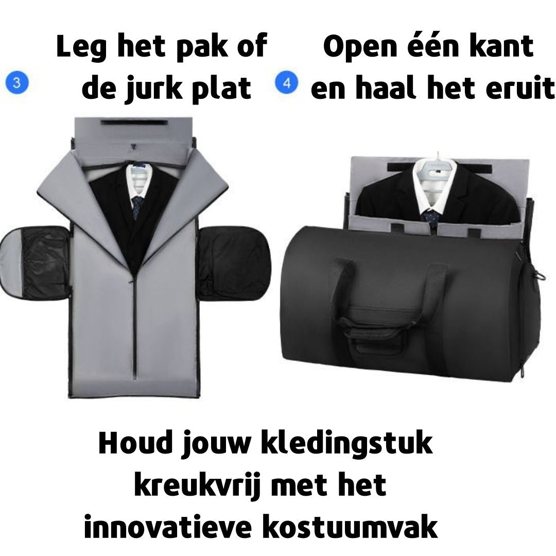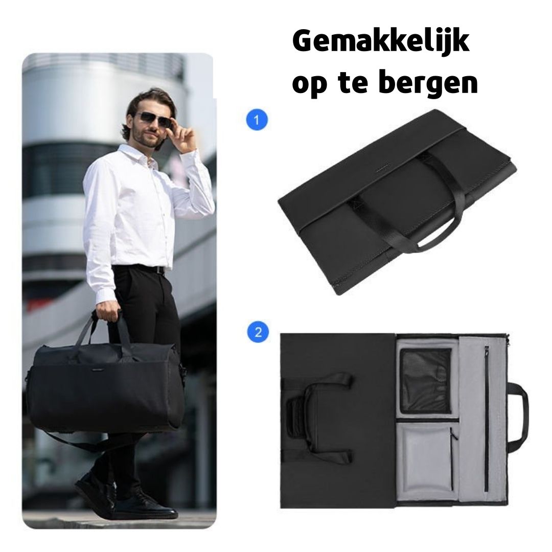 Deze luxe reistas is stevig, ruim, gemakkelijk in te delen en waterdicht. De tas is perfect voor een korte trip, weekend weg of een zakenreis en de duffeltas is geschikt voor dames en heren. Het unieke aan deze tas is dat je het uit kunt vouwen en het als kostuumtas kunt gebruiken. Zo kun je kreukvrij een pak, overhemd, blouse of jurk in de tas vervoeren. De tas heeft verschillende handige voordelen die jouw trip nog comfortabeler maken!