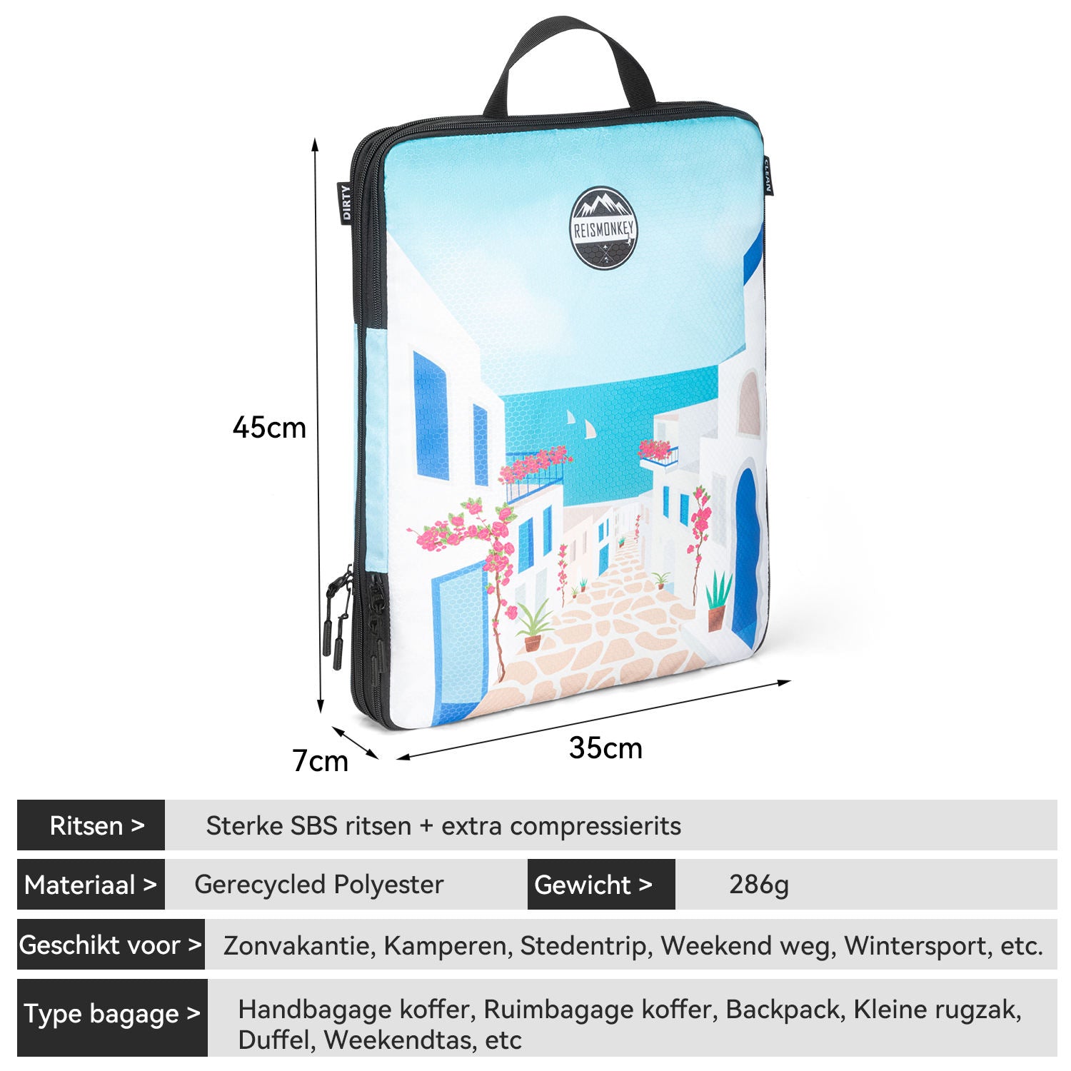 Wij merkten onder onze klanten dat er veel vraag was naar een extra grote XXL cube. Daarom heeft Reismonkey een unieke, extra grote maat uitgebracht. Nu gaan we nog een stap verder en voegen we het Clean & Dirty-systeem toe. Met deze extra grote cube wordt het makkelijk om kleding die veel ruimte inneemt mee te nemen en compact te houden. Je kleding blijft je hele reis georganiseerd en de compressierits haalt de lucht uit je kleding. Zo maak je het tot 3x zo compact en het formaat past precies in de helft van een handbagagekoffer of in je ruimbagage of Handbagage Rugzak.