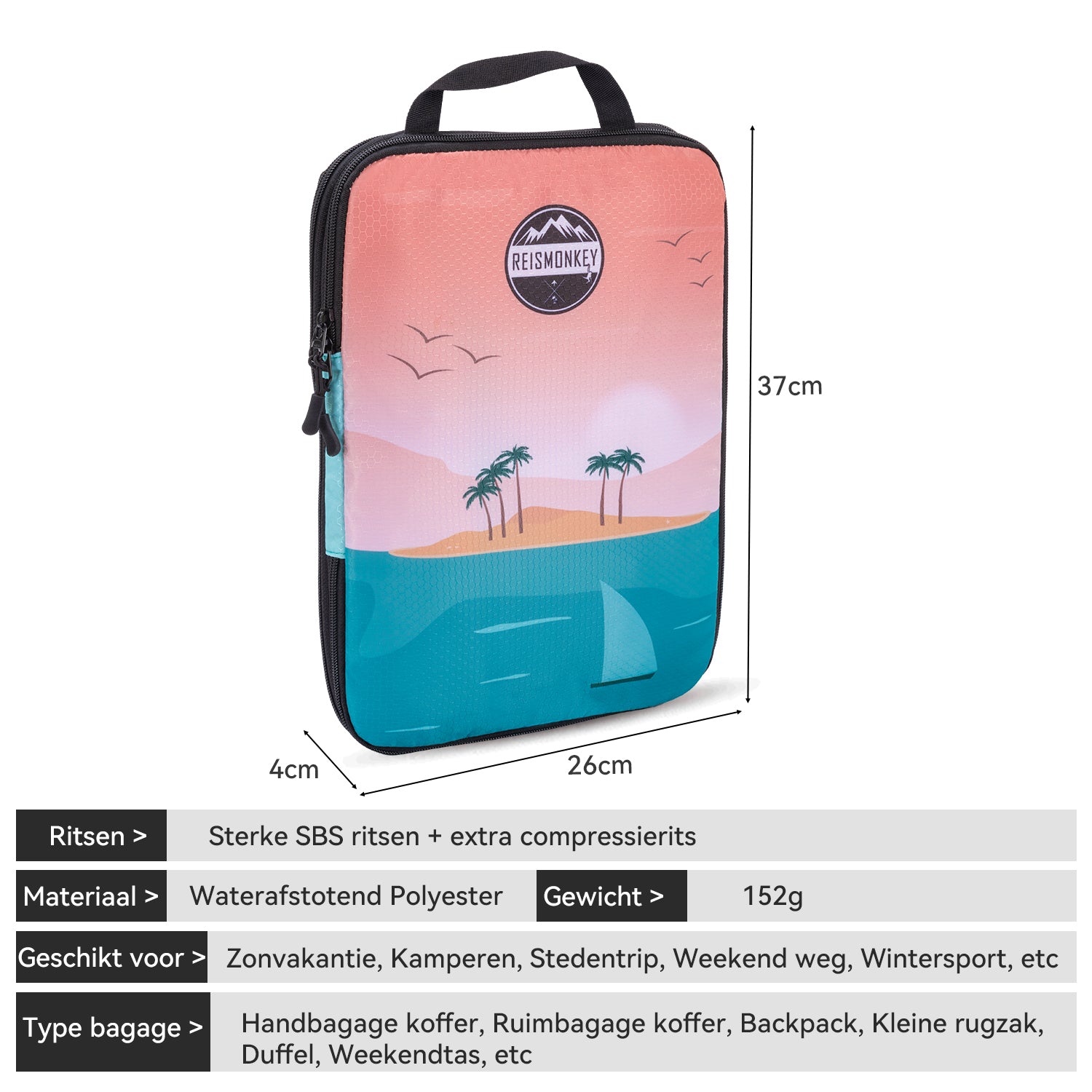 Door dit gave design van een tropisch eiland met palmbomen krijg jij extra veel zin om in te pakken voor jouw volgende reis. De cube is geschikt voor jouw handbagage, backpack, Kleinere rugzak, duffel, weekendtas. Door het handige formaat kun je deze cube voor al jouw reizen gebruiken en is dit dus ook een ideale aanvulling op jouw andere packing cubes!